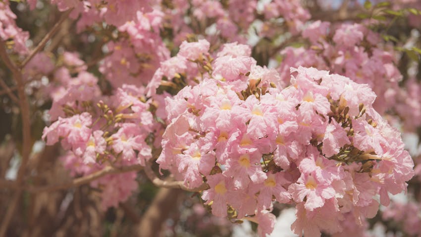 Bunga tabebuya ini terkenal karena keindahannya, dengan warna yang mencolok seperti pink, kuning, dan putih.