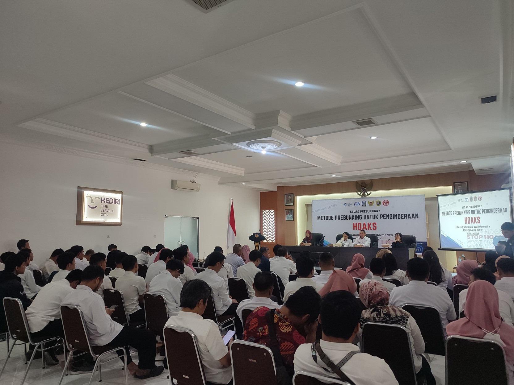 DAMAREMAS.COM, Kediri – Penyebaran hoaks dan informasi yang salah menjadi tantangan besar dalam era digital saat ini. Menanggapi hal tersebut Dinas Komunikasi dan Informatika Provinsi Jawa Timur berkolaborasi dengan Dinas Komunikasi dan Informatika Kota Kediri menggelar kelas Prebunking yang bertempat di Ruang Kilisuci Balaikota Kediri, Rabu (8/5). Mengangkat tema Metode prebunking untuk penginderaan hoaks, kegiatan ini diisi narasumber dari Masyarakat Anti Fitnah Indonesia (Mafindo) Surabaya dan mengundang peserta dari kelompok informasi masyarakat (KIM) di kelurahan dan kecamatan se-Kota Kediri.