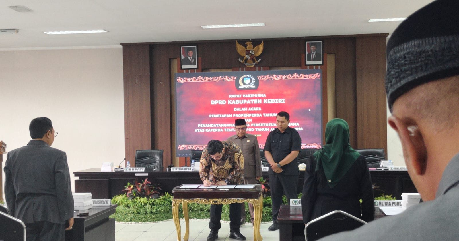 Sebagai puncak agenda rapat paripurna, dilakukan penandatanganan Nota Persetujuan Bersama atas Raperda APBD Kabupaten Kediri Tahun Anggaran 2026 oleh Bupati Kediri dan pimpinan DPRD Kabupaten Kediri.